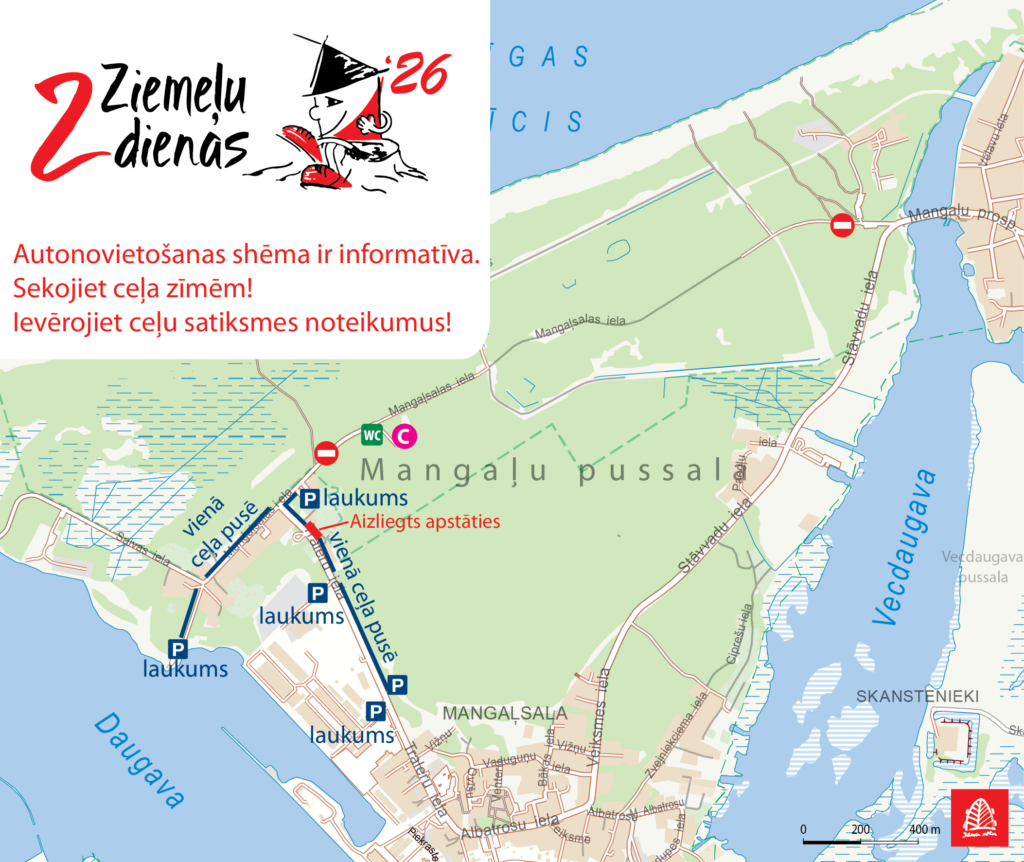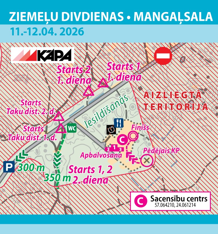 Ievēro: Ierašanās Mangaļsalā uz sacensību centru OBLIGĀTI ievērojot ceļazīmes! Mangaļsalas iela slēgta satiksmei (sacensību rajons)